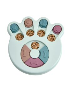 My Border Collie, Grace, just loves this “toy.” Dogs like Grace need constant mental, physical, and emotional stimulation and this thing helps for a few minutes in the evening. She has learned to check index every one, looking for a treat. When she finds one, she not only gets a treat, but she gets our praise. She has learned to use both her nose and her paw to manipulate the rounds. It is well built and heavy enough that it stays in place when Grace is playing with it. Because she still chews everything, after a few games, we take it up off the floor. Wonderful toy and I’m highly recommending.