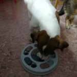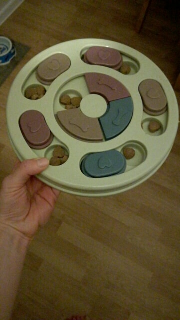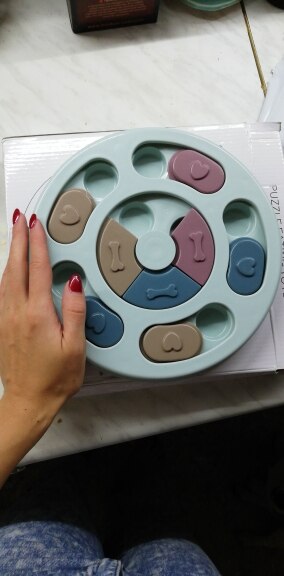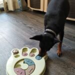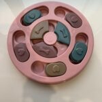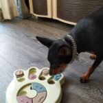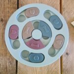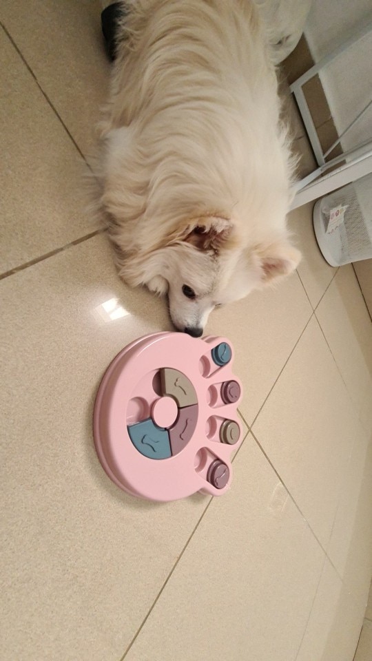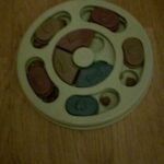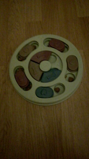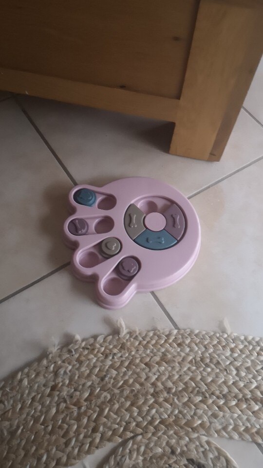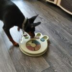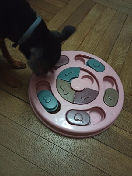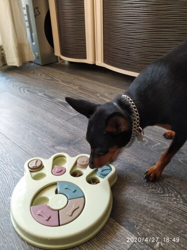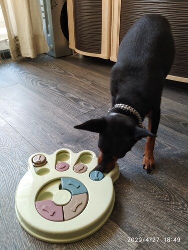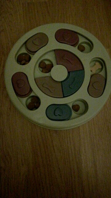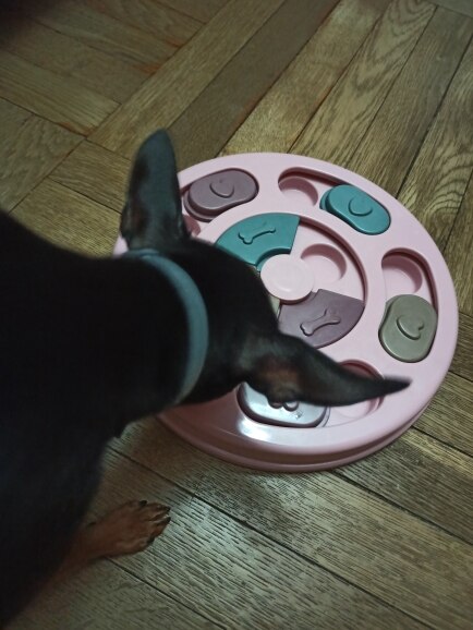My Border Collie, Grace, just loves this “toy.” Dogs like Grace need constant mental, physical, and emotional stimulation and this thing helps for a few minutes in the evening. She has learned to check index every one, looking for a treat. When she finds one, she not only gets a treat, but she gets our praise. She has learned to use both her nose and her paw to manipulate the rounds. It is well built and heavy enough that it stays in place when Grace is playing with it. Because she still chews everything, after a few games, we take it up off the floor. Wonderful toy and I’m highly recommending.