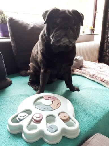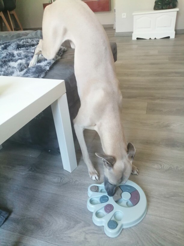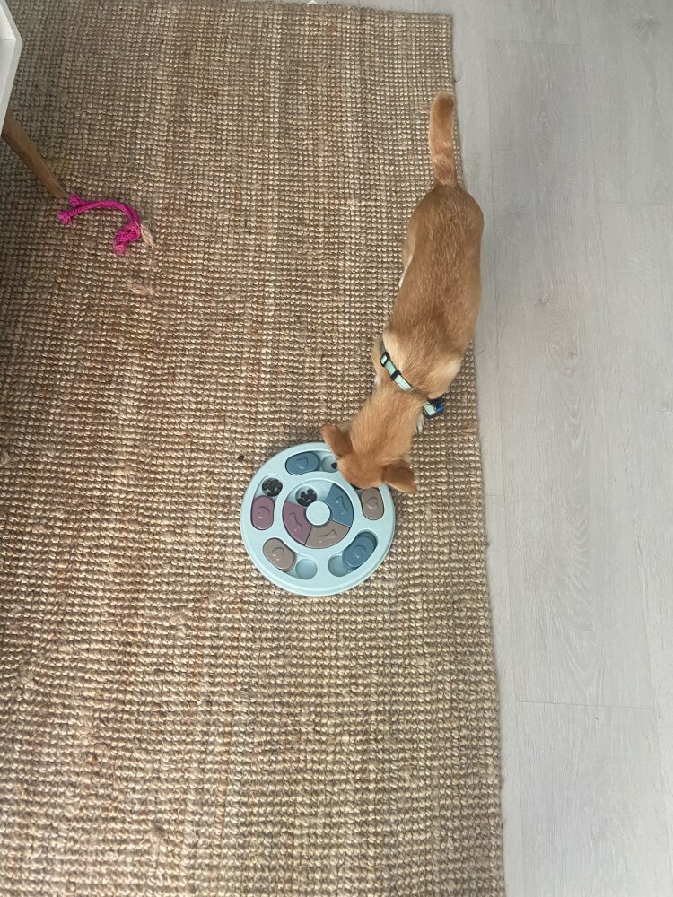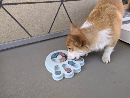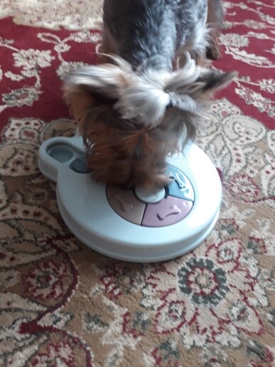 I wasn’t sure if my dog would have anything to do with this. I put treats in it and set it by my dog’s bed. I adopted him after he was rescued from a hoarding situation so he really hasn’t had toys to play with. I’ve had to teach him how to play with them. I noticed the freebie treats were gone one day and checked the rest of the puzzle. All gone! I was amazed. Filled it back up and left it for a few days. Empty again. Now I’ve watched him do it and it’s so funny. I’m going to try to get a video of it. He’s a 15lb chiweenie. Half chihuahua half dachshund and much smarter than I gave him credit. lol