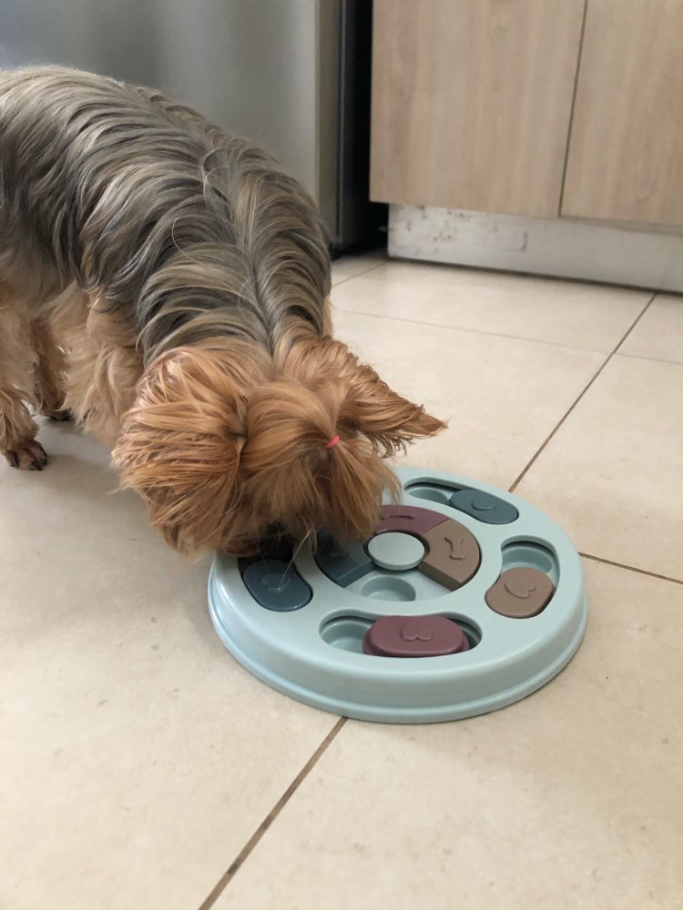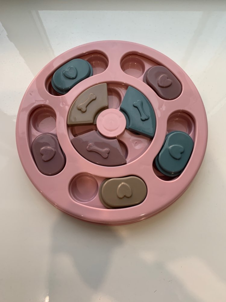 So my dog is a confirmed genius- just kidding but she solved this in less than a minute. I thought about getting a more complex puzzle but thought I’d try this one out first in case she wasn’t a genius. The only negative aspect of the product is that if your dog chews up toys she will probably chew up the puzzle pieces. So this is a puzzle I’d recommend using if you are home with your pet. I’ll look for another one to use when I am gone to keep her busy mind occupied.