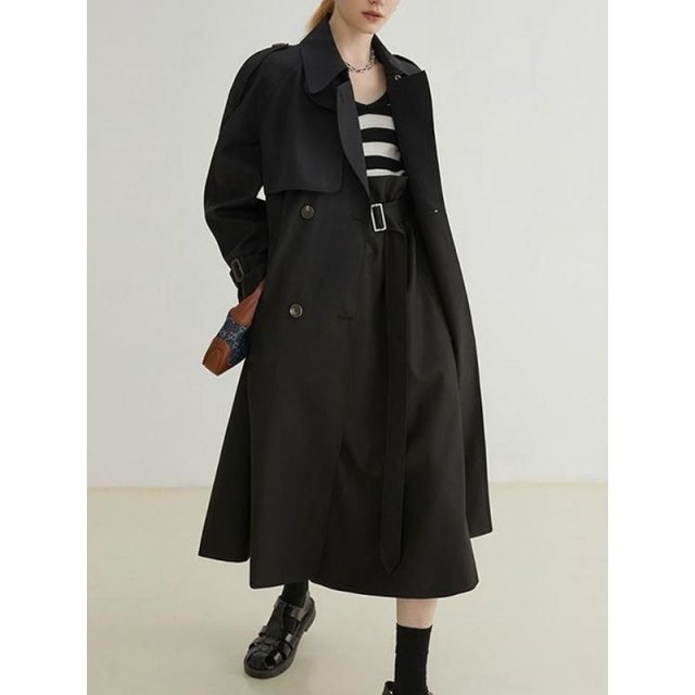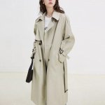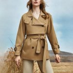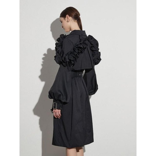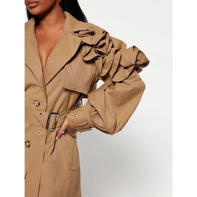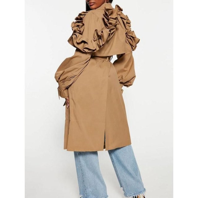 - Design: Chic spliced ruffles coupled with a belt, adding a modern twist to the classic trench coat.