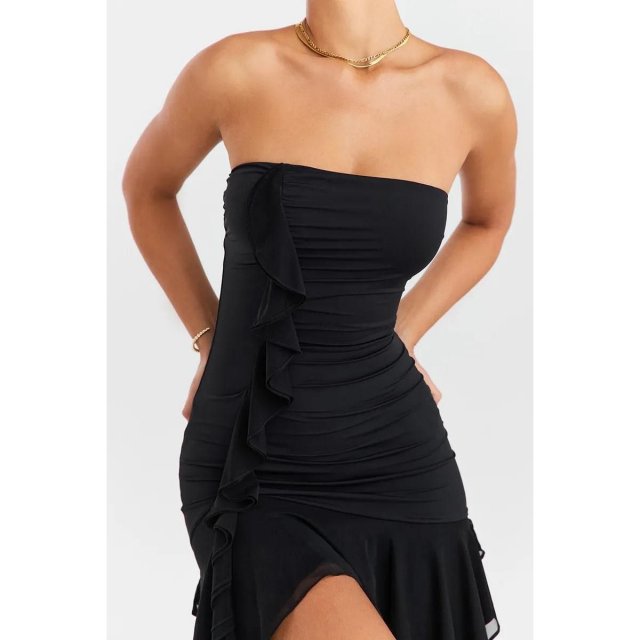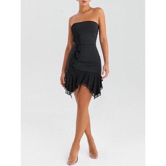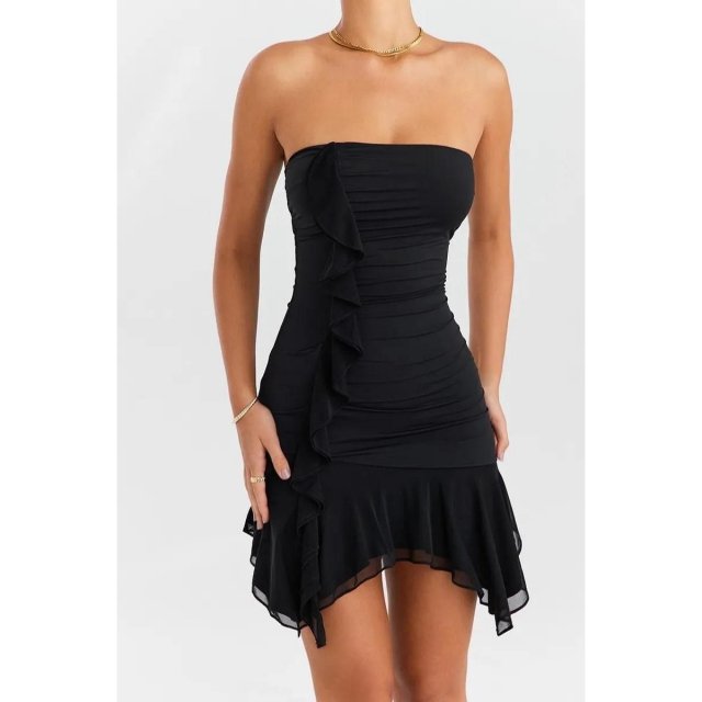 The Strapless Ruffles Mini Dress embraces your femininity with a bodycon fit that effortlessly accentuates your natural factors. The backless design adds a touch of allure, making it ideal for club parties or any special occasion.