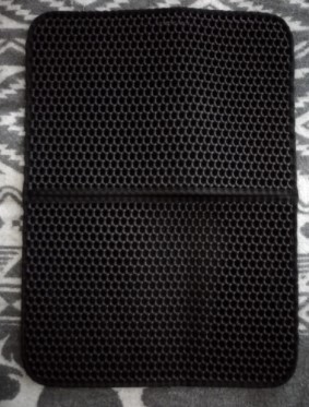 Decided on this item as had the same features as the slightly more expensive versions and the cheeper ones didnt look like they would work for me. The cats are happy with it and the honeycomb structure catches the wood pellets as I was hoping. The top layer is made from an eva type material so it’s quite soft and spongy Really easy to clean I spray with bathroom cleaner and shower it all off in the bath when needed. My bathroom floor stays so much cleaner now the wood dust and pellets stay mostly contained in the mat. I think that if I was using fine grained clay or corn litter it would be even more efficient (I knew that the pellets.wpuld be a bit big for the design but it makes a big difference) I would reccomend this without hesitation 🙂