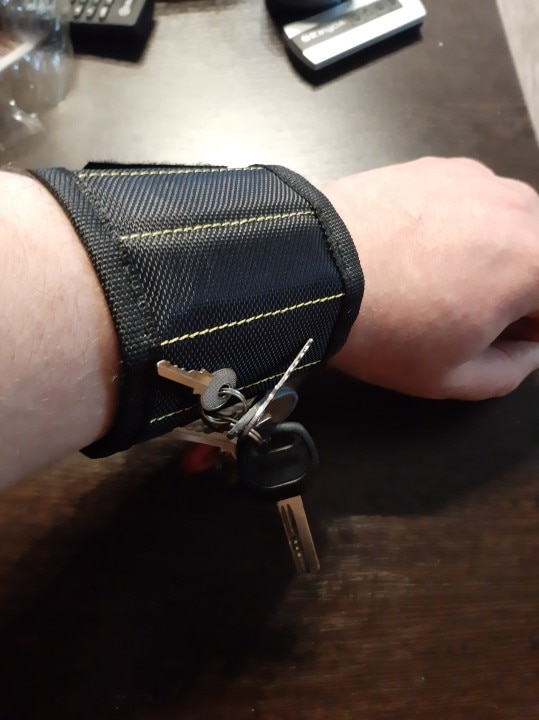 Always need someone to help me pick up or pass the small parts, nails, nuts, screws when I am working on the ladder. With the wristband I no longer bother my family. Strong enough for drill bits and big nails. Great to have in my tool bag.