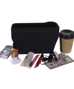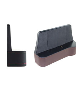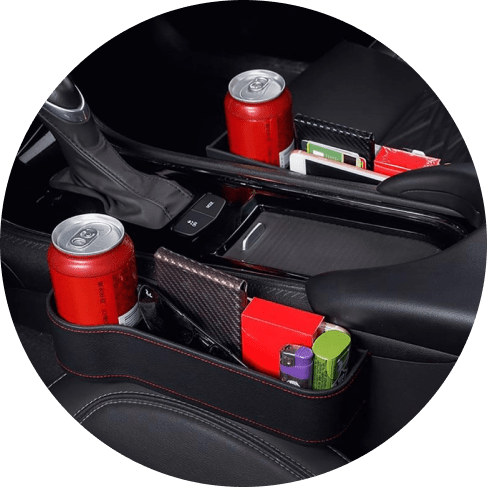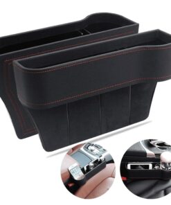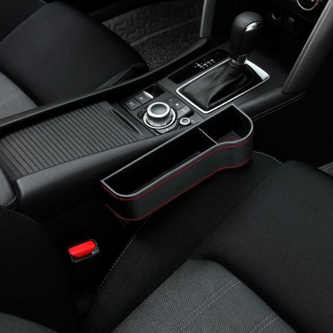 Our Multifunctional Car Seat Organizer fits into the space between your car seat and center console for an out-of-the-way storage accessory that also is conveniently within reach. Our Multifunctional Car Seat Organizer features a coin holder, curved spot to hold a tumbler or drink, and even built-in ports to facilitate flow of charger cables for devices. Plus, a luxe black, expert-crafted PU leather design (with visible red stitching detail) adds a stylish touch that blends into just about any car interior. Above all, our organizer is easy to install: just insert into the space between your seat and center console — no drills or attachment clips required. Itโs a high-crafted solution to help tidy up your ride.