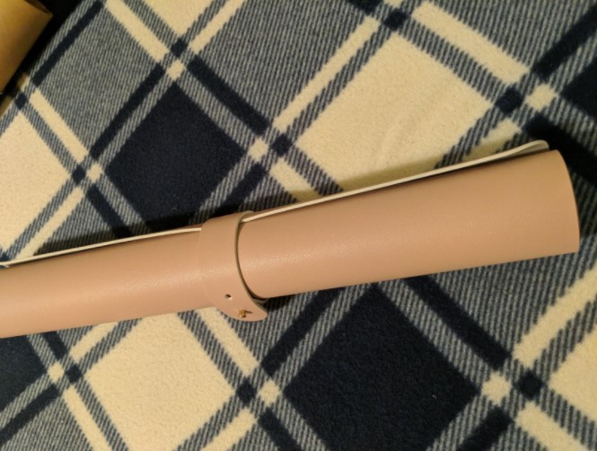 I love the colors of my Desk pad, and it is soft enough to support me doing schoolwork without my pen squishing right through the paper. The only complaint I have is the strap put around the rolled up pad is too small. I found it impossible to roll it up tight enough to attach the strap, and it makes sense why it was loose in the box and not already on. This is a very small complaint, as I will likely never need to move the pad from my desk and will likely lose the strap anyways. Thank you, and have a wonderful day!