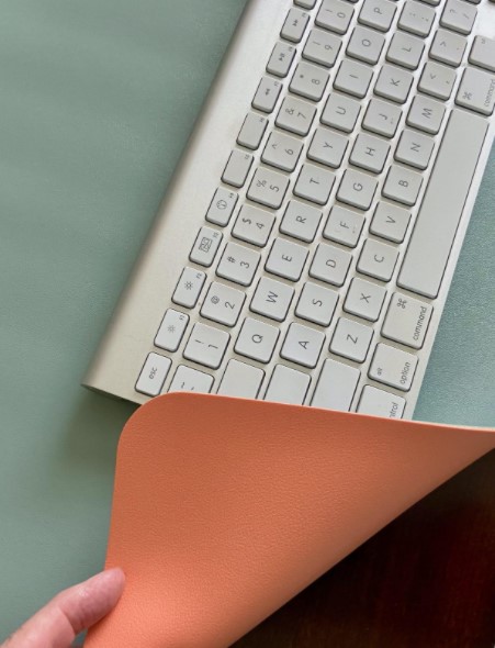It’s perfect for my Apple wireless keyboard and mouse. It protects the main work area of my desk while not interfering with my laptop/external monitor arrangement and other desktop items. The colors are even better than I had expected. the orange is more of a soft peach color, and the green is a silvery sage color. The pad arrived rolled with tissue paper in a sturdy box with an enclosed silica packet. Love this product!