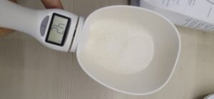 I think a wonderful idea, but sticks. I cannot use the scoop to scoop and weigh, I havs to use another scoop to gently put the dog bisciut in and it seems to get to around 65g and stops, to by pass this I have to press scoop it goes up and then comes back to a weight…but this is mainly for our holidays so that I do not have to take scales with me to weigh my dogs meals!..Love the idea just needs tweaking!..I have lived with a set of digital scales without 75g on for an eternity..I am sure I can givean extra press to vet rhe right weight! As accurate as my salter kitchen scales..once pressed and added or taken food out to get 76g..