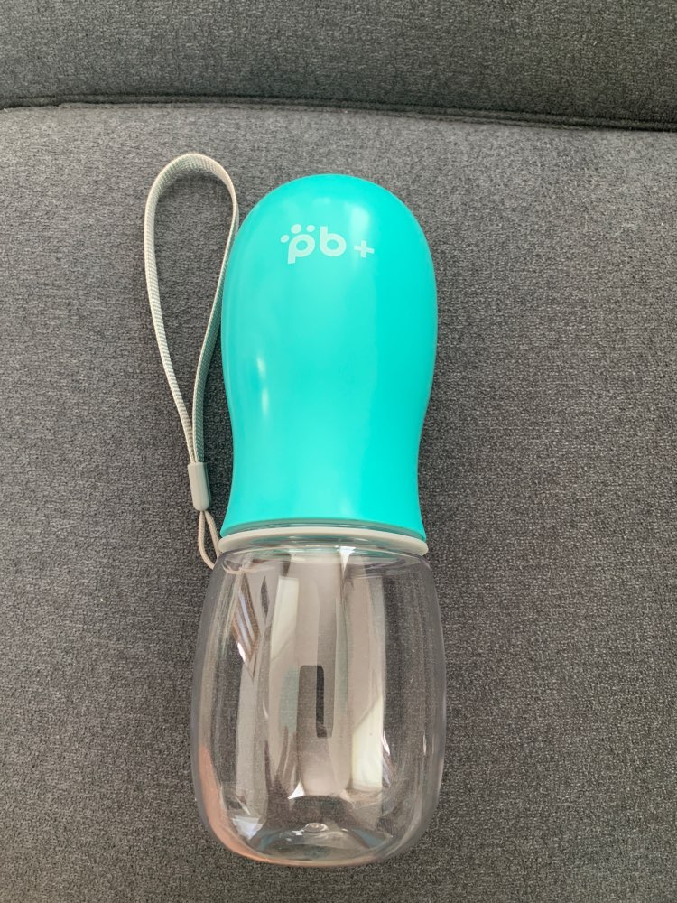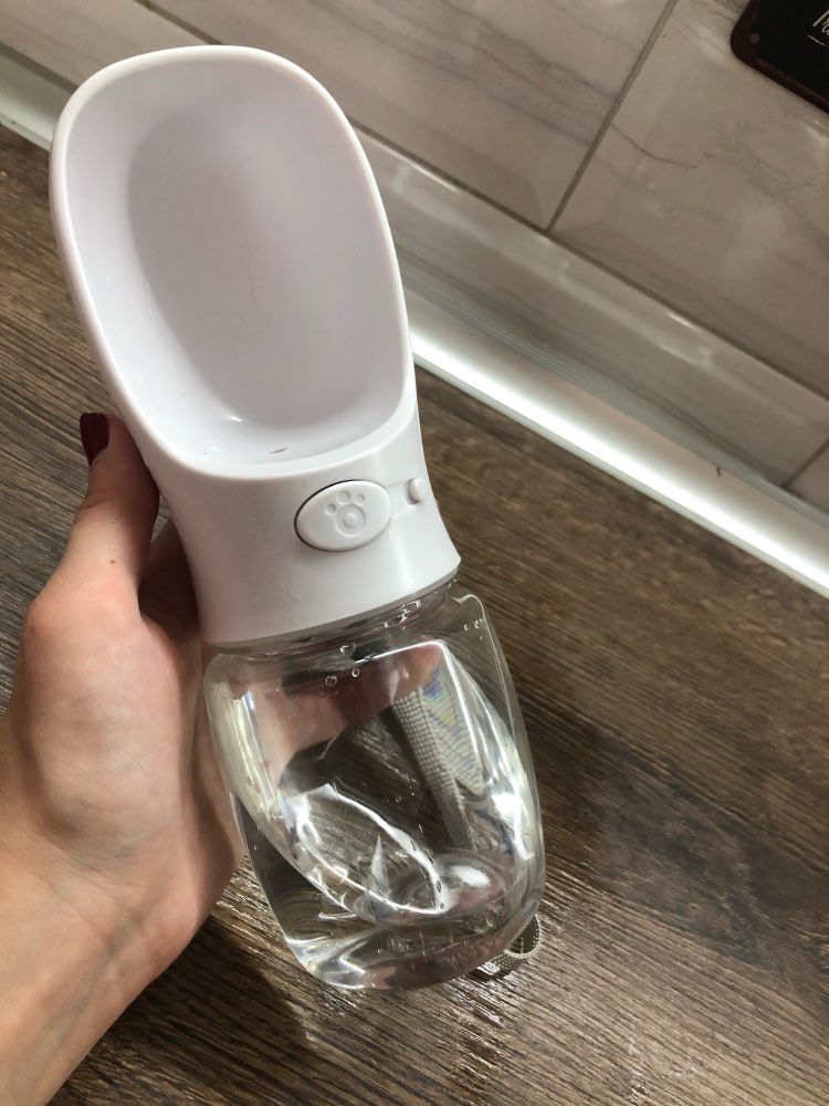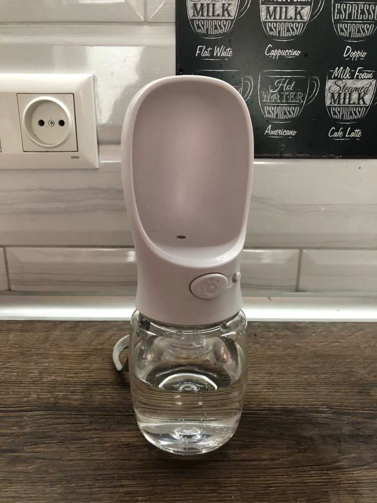 This is a great little dog water bottle that is very convenient! When we travel, I keep it in one of the cup holders because it fits nicely there. It took a few washings to reduce the plasticy smell but it was fine after that.