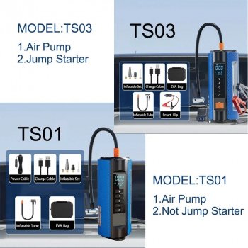 - Two distinct models: TS01 offers reliable air-pumping, while TS03 combines an air pump with a jump starter.