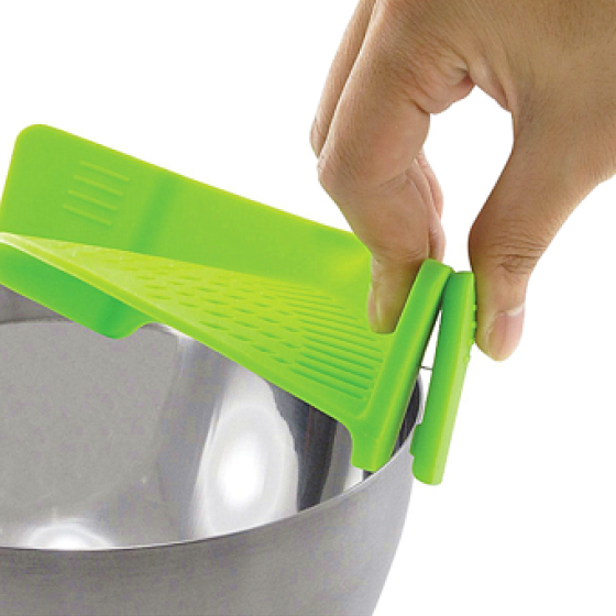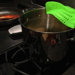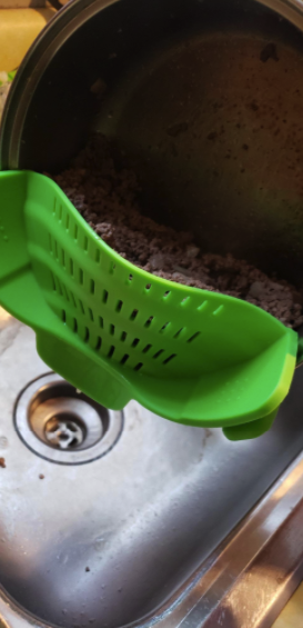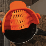 This makes it so much easier to dump out water when making pasta of any type. Fits very well to most sized pans and dishwasher safe. My 9 yr old granddaughter can now dump the water out of the Mac and cheese easily. This is a must have for people who make Pastas of any kind that require dumping out hot water. It is made out of a type of rubber so I’m not sure if I would use it for hot grease, but it may be ok for that too since a lot of spatulas etc are made from similar material