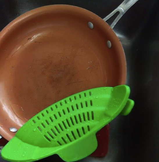 I absolutely love this strainer. It works on pots and pans with or without a rim perfectly. For pots with a rim or lip, you just need to hook it into place by opening the clip and sort of sliding it over/around the rim. The clips don’t open wide but I prefer that because it makes the strainer more secure. For anyone worried about it scratching your pans – This strainer is a thick, soft silicone and the clips are covered as well, so no metal will touch your cookware. I’ve used this on non-stick saucepans, stainless skillets and pans, stockpots and cast iron, an enameled dutch oven, and soup bowls with zero issues.